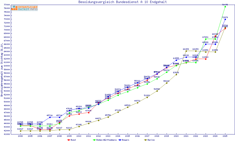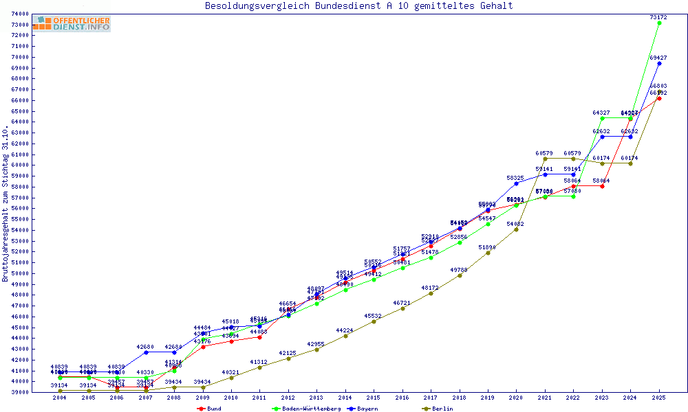 | Besoldungsvergleich A 10 im Jahr 2025 | gemitteltes Gehalt | ||||||