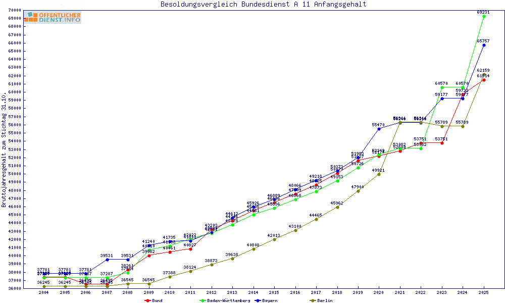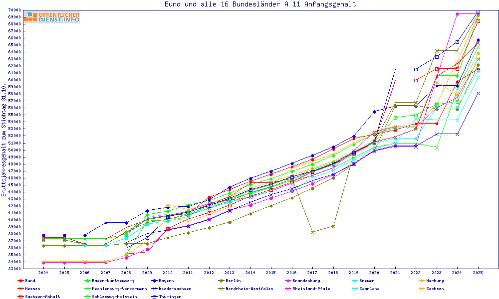 | Besoldungsvergleich A 11 im Jahr 2025 | Anfangsgehalt | ||||||