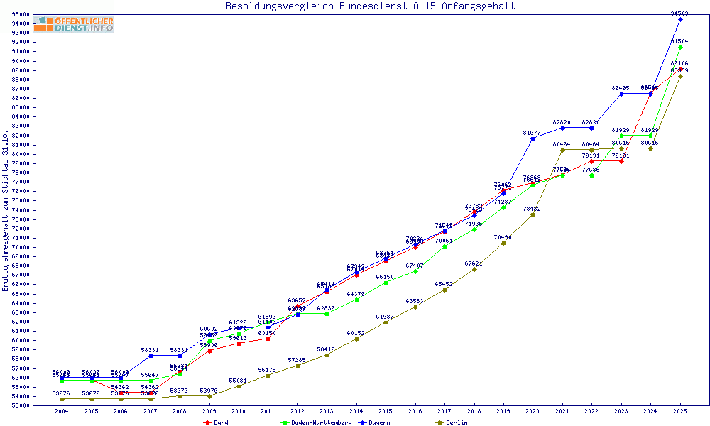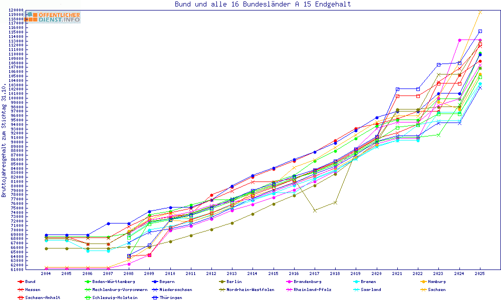 | Besoldungsvergleich A 15 im Jahr 2025 | Anfangsgehalt | ||||||