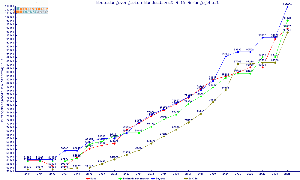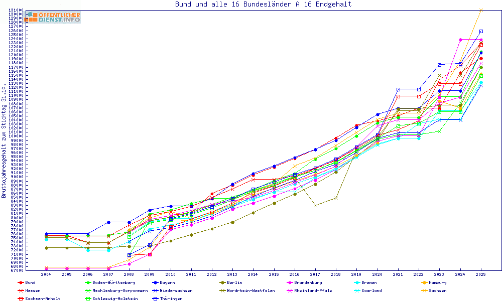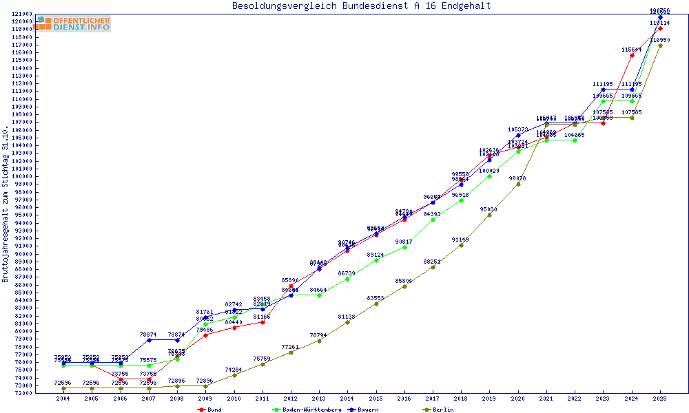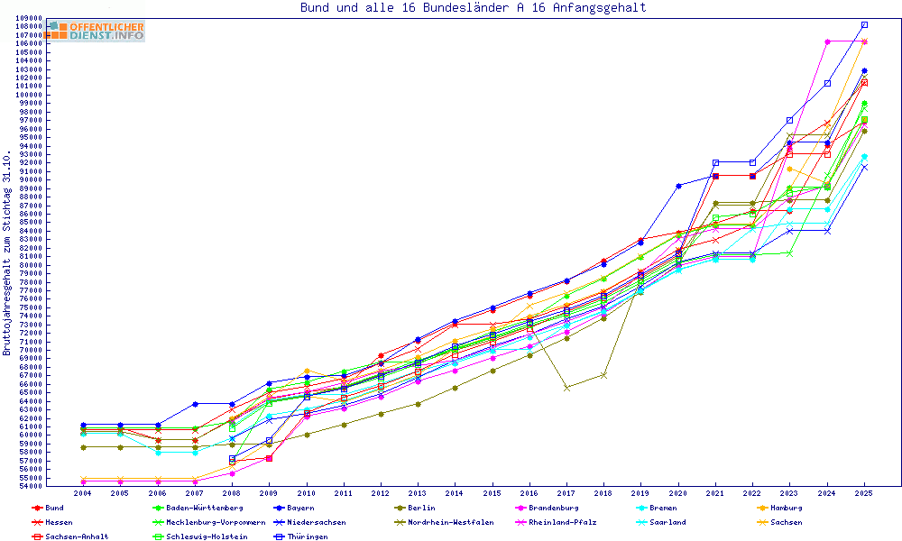 | Besoldungsvergleich A 16 im Jahr 2025 | Anfangsgehalt | ||||||