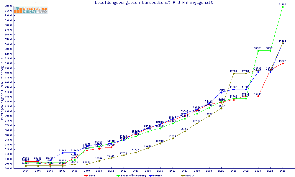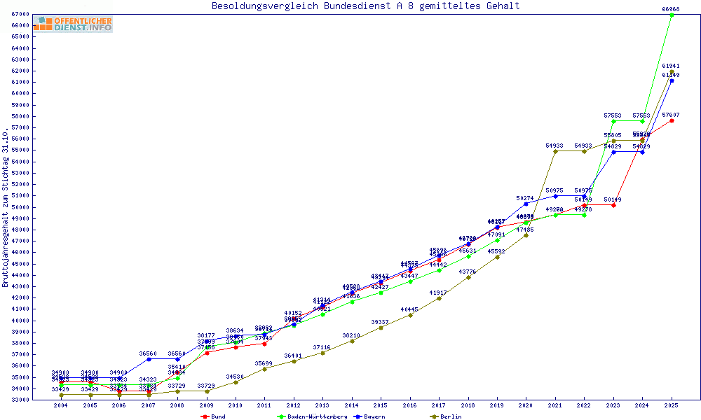 | Besoldungsvergleich A 8 im Jahr 2025 | Anfangsgehalt | ||||||