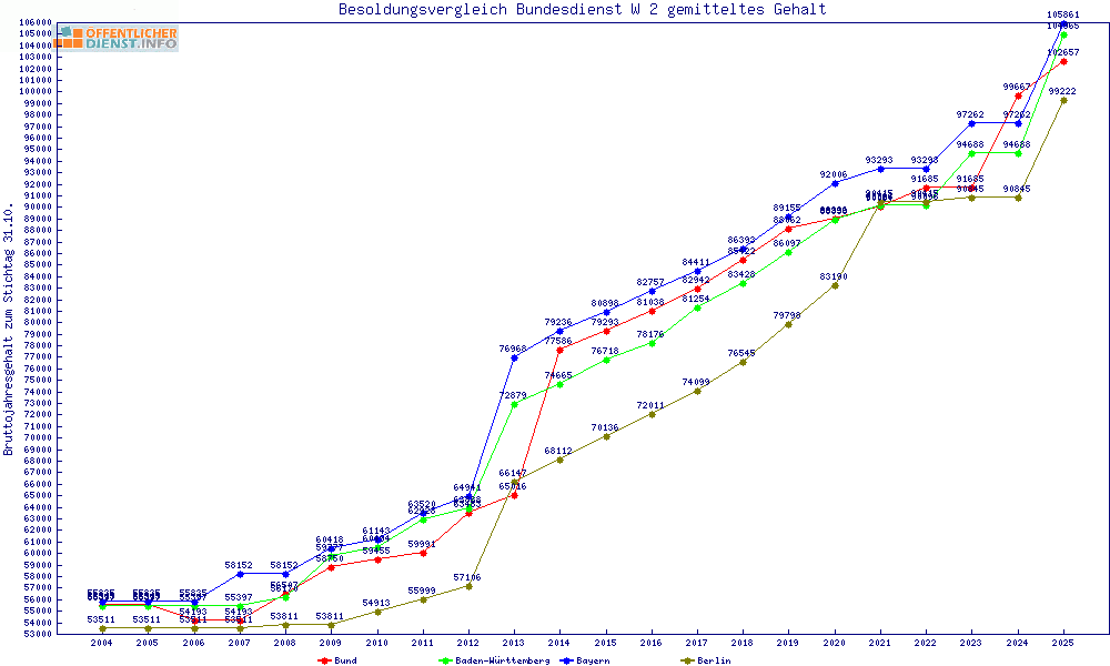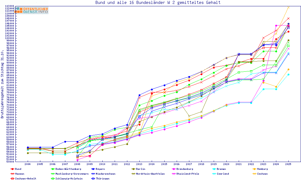 | Besoldungsvergleich W 2 im Jahr 2025 | gemitteltes Gehalt | ||||||