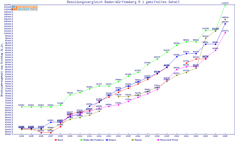 | Besoldungsvergleich R 1 im Jahr 2025 | gemitteltes Gehalt | ||||||