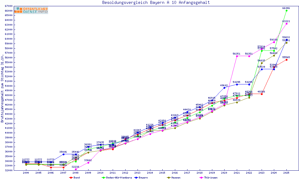 | Besoldungsvergleich A 10 im Jahr 2025 | Anfangsgehalt | ||||||