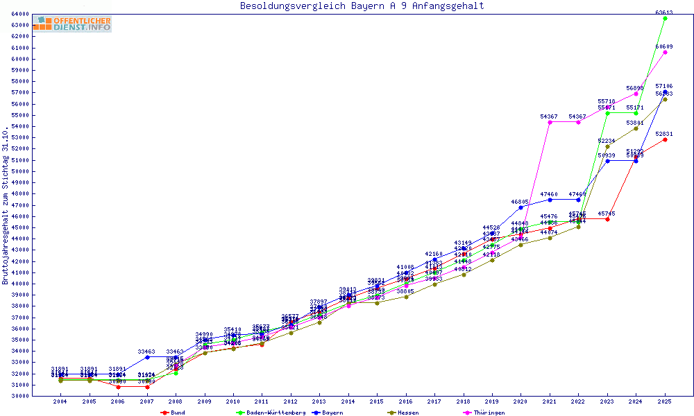| Besoldungsvergleich A 9 im Jahr 2025 | Anfangsgehalt | ||||||