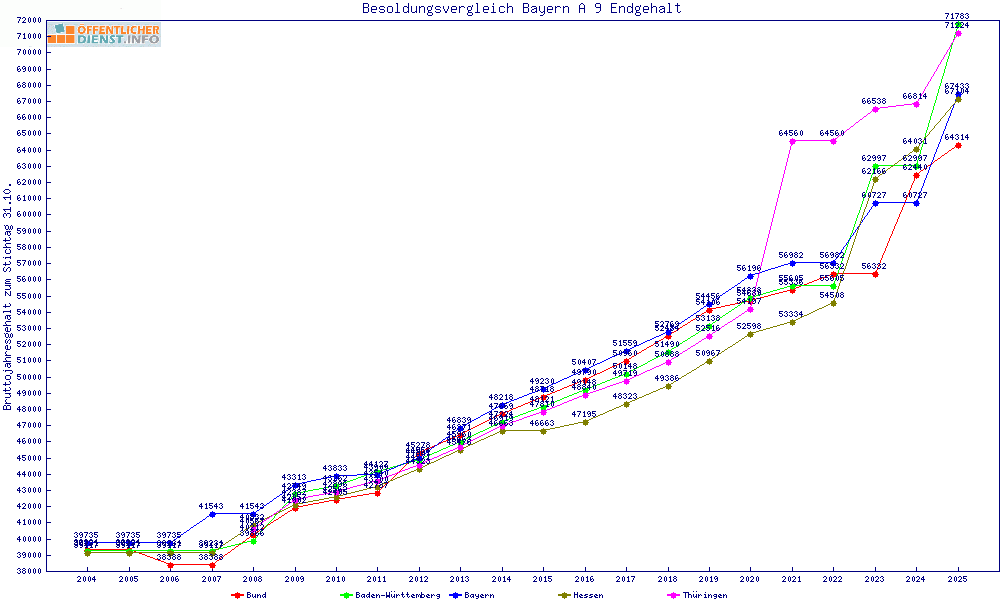| Baden-Württemberg | 71.784 € | +4350 € | +6.5% | +4319 € | +6.4% | 26 Jahre | ||