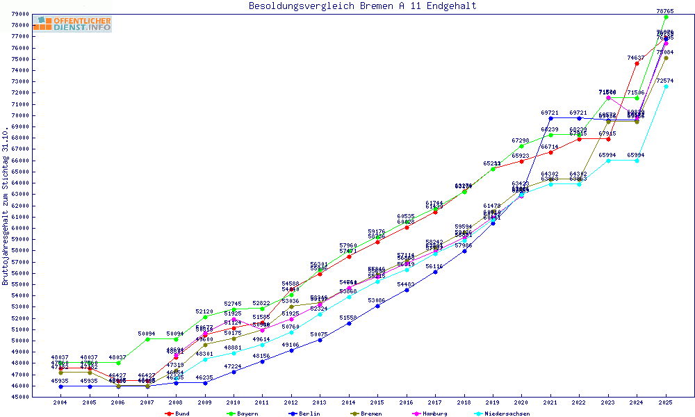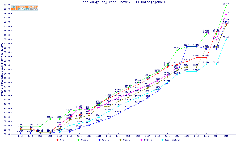 | Besoldungsvergleich A 11 im Jahr 2025 | Anfangsgehalt | ||||||