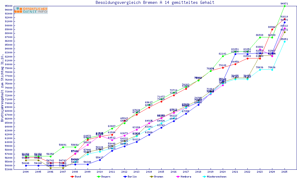 | Besoldungsvergleich A 14 im Jahr 2025 | gemitteltes Gehalt | ||||||