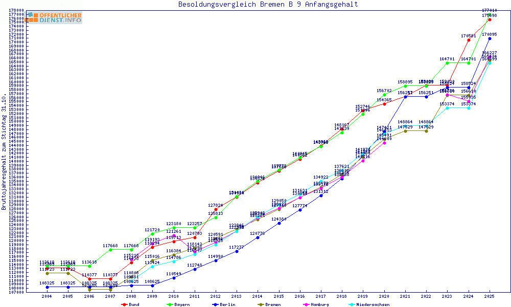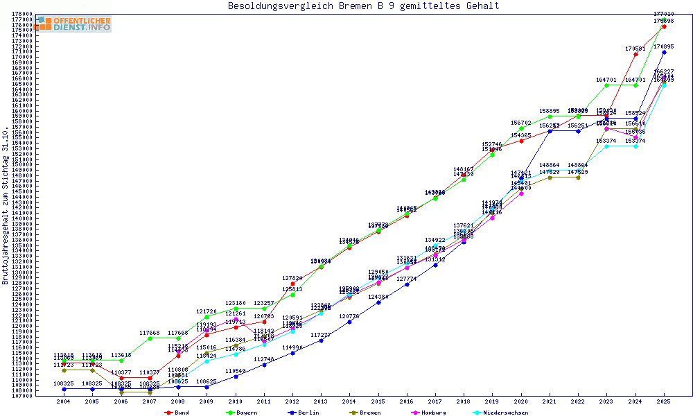 | Besoldungsvergleich B 9 im Jahr 2025 | gemitteltes Gehalt | ||||||