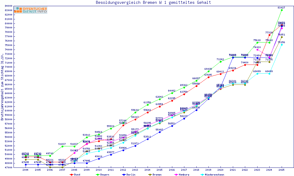 | Besoldungsvergleich W 1 im Jahr 2025 | gemitteltes Gehalt | ||||||