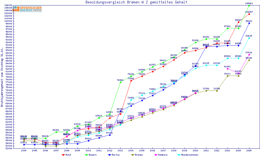 | Besoldungsvergleich W 2 im Jahr 2025 | gemitteltes Gehalt | ||||||
