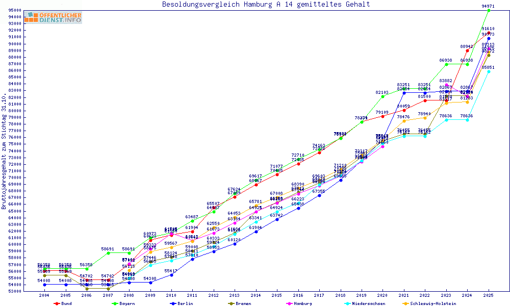| Besoldungsvergleich A 14 im Jahr 2025 | gemitteltes Gehalt | ||||||