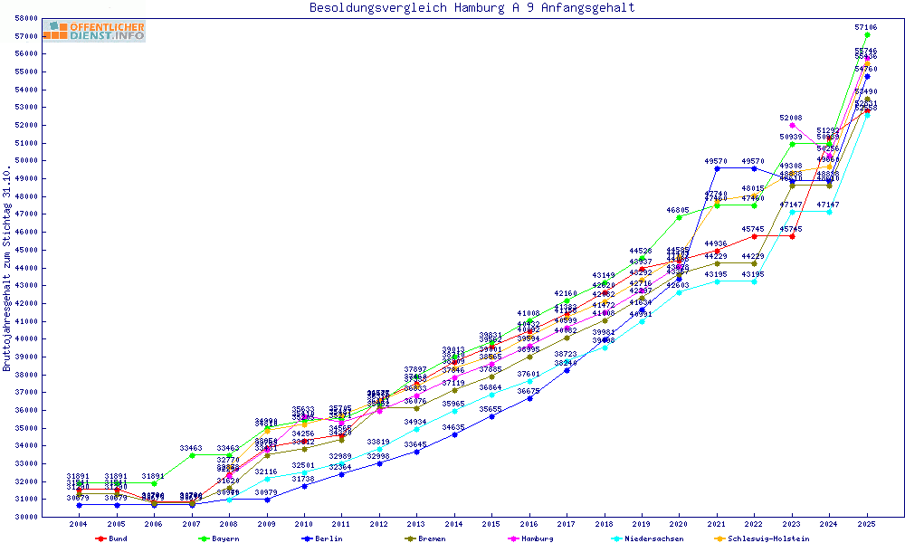 | Besoldungsvergleich A 9 im Jahr 2025 | Anfangsgehalt | ||||||