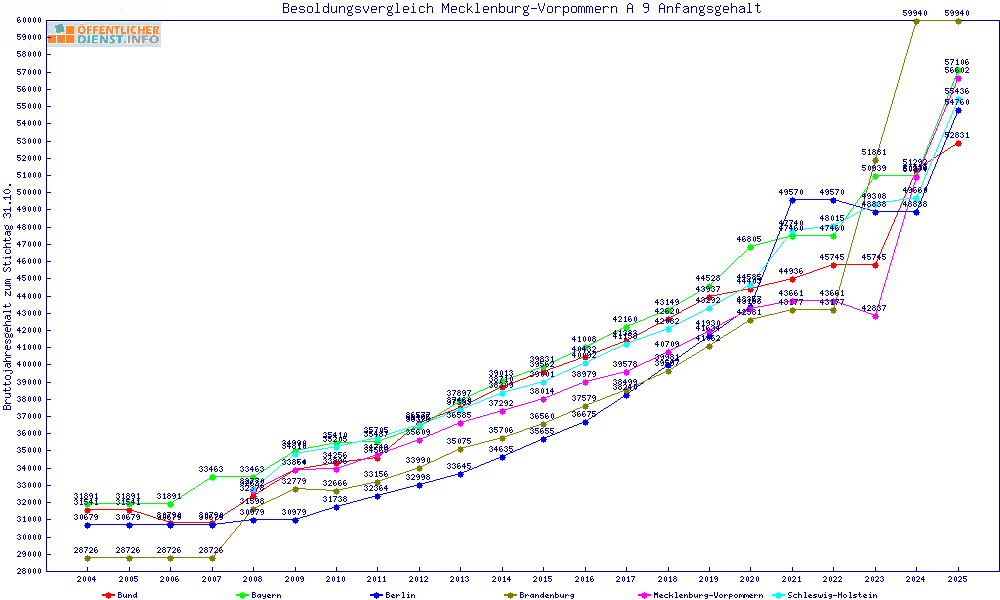 | Besoldungsvergleich A 9 im Jahr 2025 | Anfangsgehalt | ||||||
