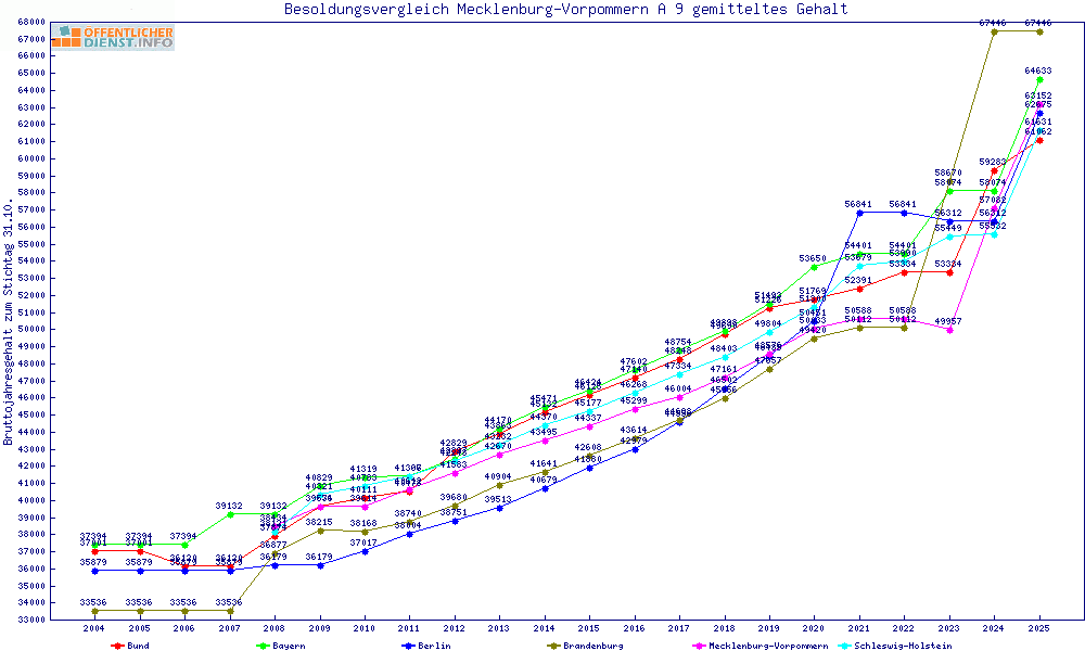 | Bayern | 67.433 € | +1190 € | +1.8% | -30 € | -0.0% | 24 Jahre | ||