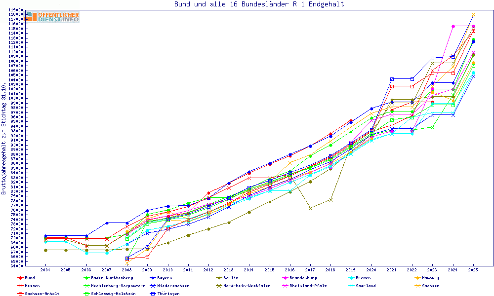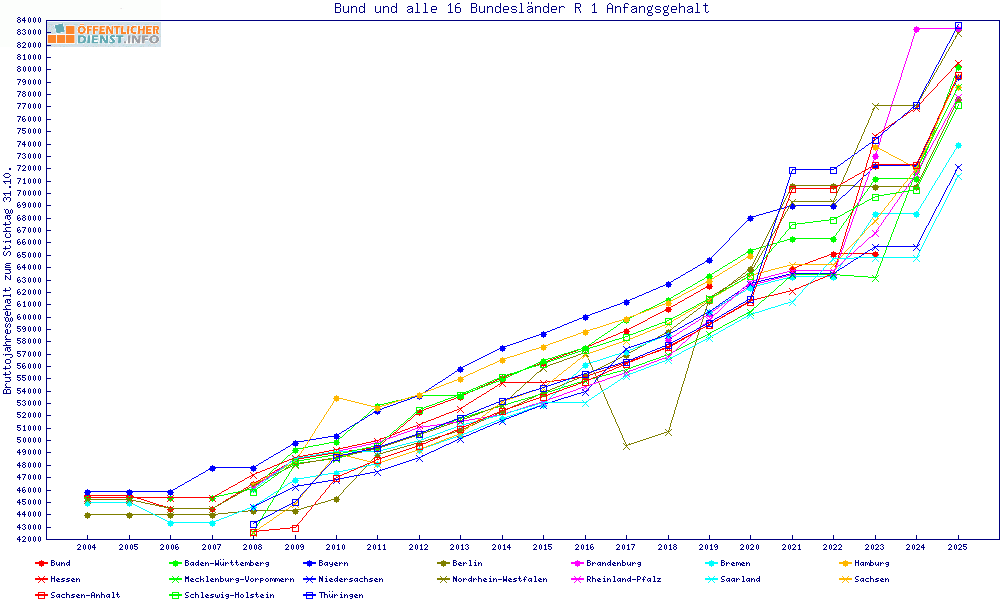 | Besoldungsvergleich R 1 im Jahr 2025 | Anfangsgehalt | ||||||