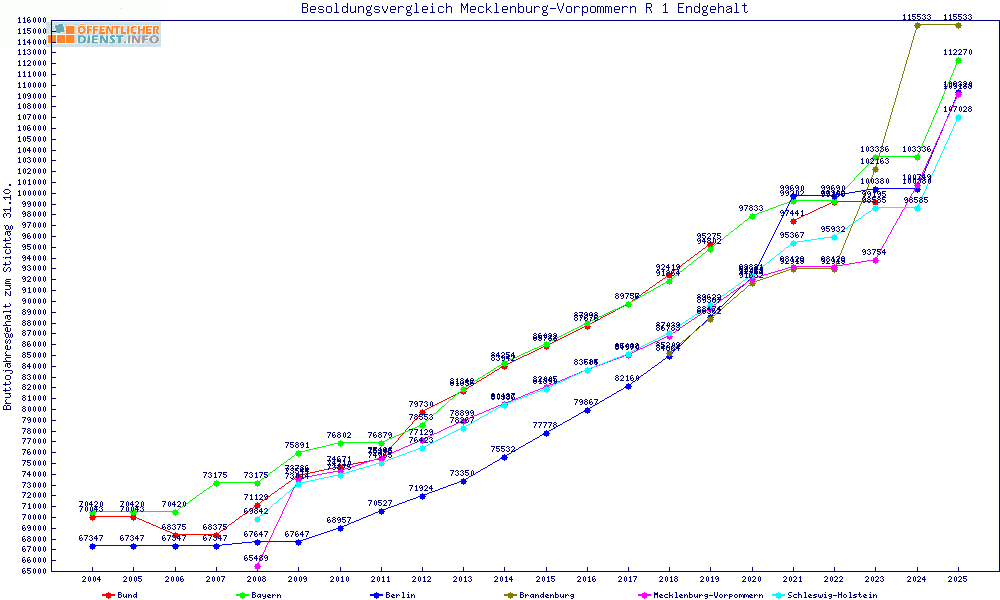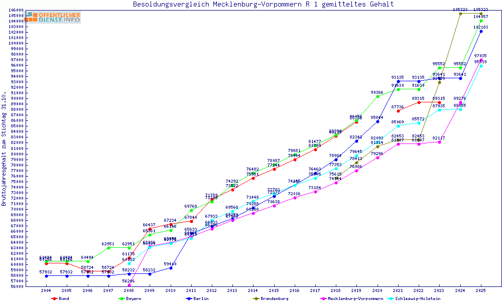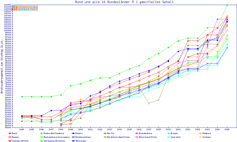 | Besoldungsvergleich R 1 im Jahr 2025 | gemitteltes Gehalt | ||||||