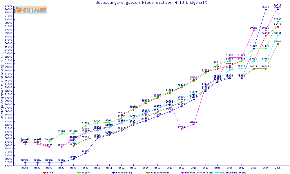 | Besoldungsvergleich A 13 im Jahr 2025 | Anfangsgehalt | ||||||
