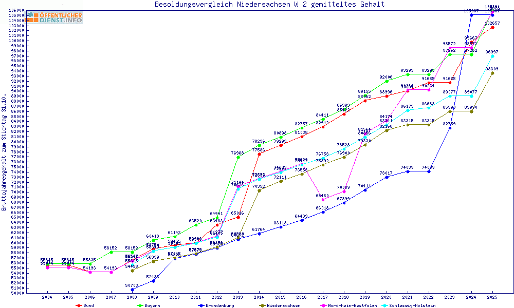 | Besoldungsvergleich W 2 im Jahr 2025 | gemitteltes Gehalt | ||||||