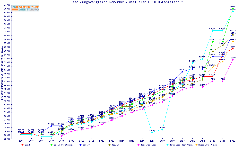 | Besoldungsvergleich A 10 im Jahr 2025 | Anfangsgehalt | ||||||