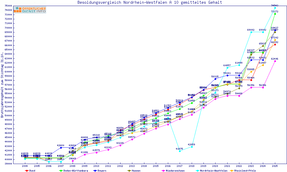 | Besoldungsvergleich A 10 im Jahr 2025 | gemitteltes Gehalt | ||||||