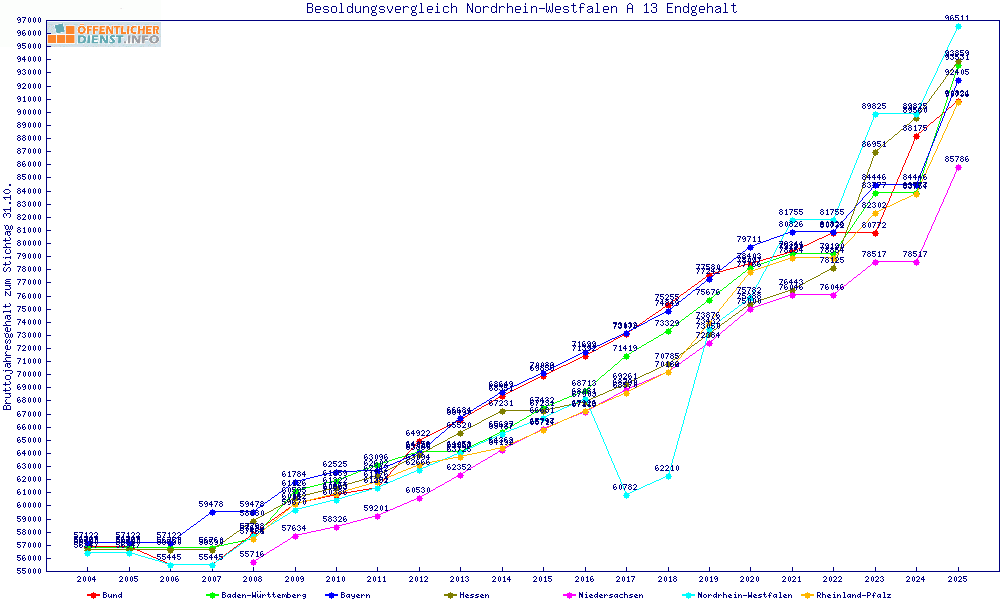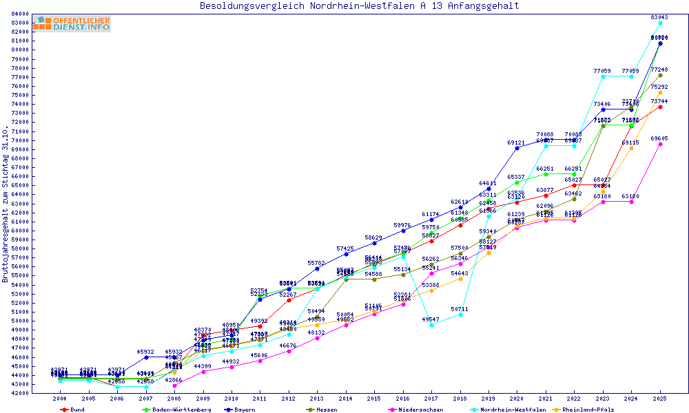 | Besoldungsvergleich A 13 im Jahr 2025 | Anfangsgehalt | ||||||
