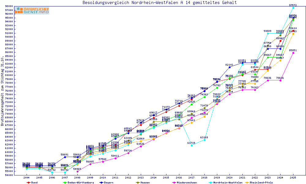 | Besoldungsvergleich A 14 im Jahr 2025 | gemitteltes Gehalt | ||||||
