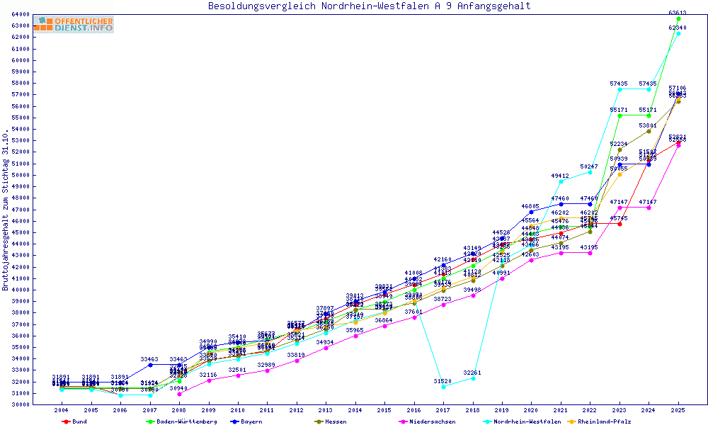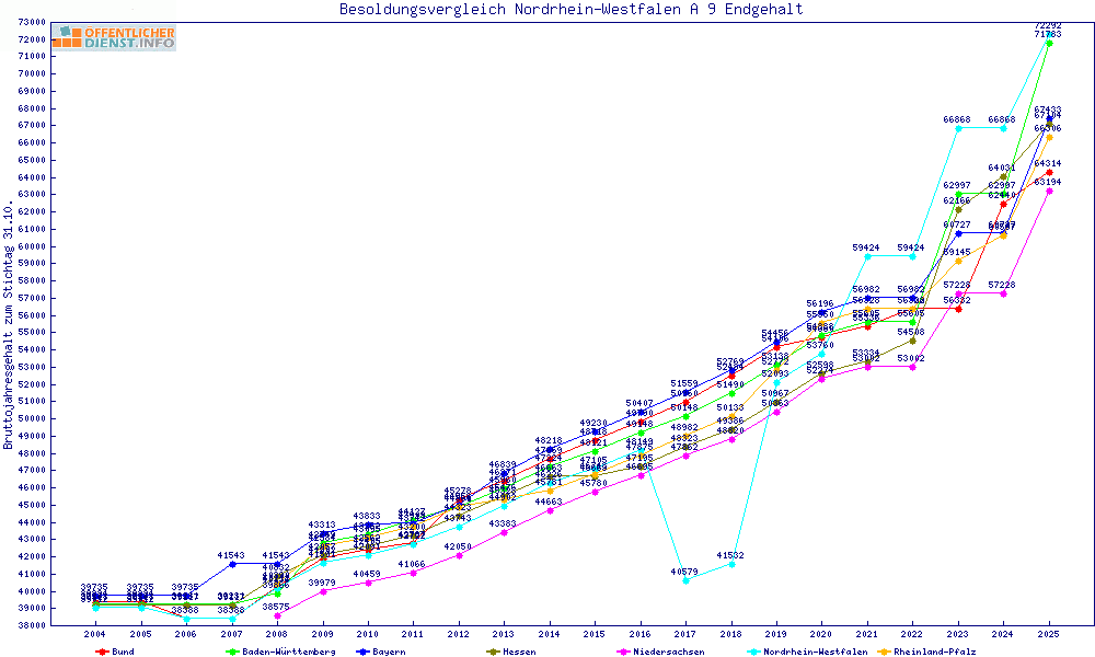 | Besoldungsvergleich A 9 im Jahr 2025 | Anfangsgehalt | ||||||