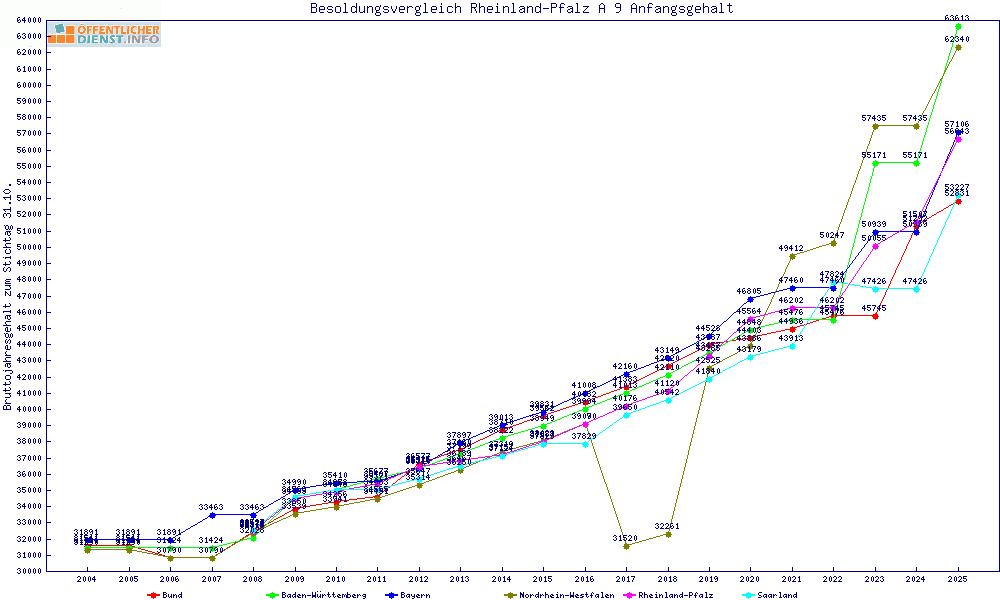 | Besoldungsvergleich A 9 im Jahr 2025 | Anfangsgehalt | ||||||