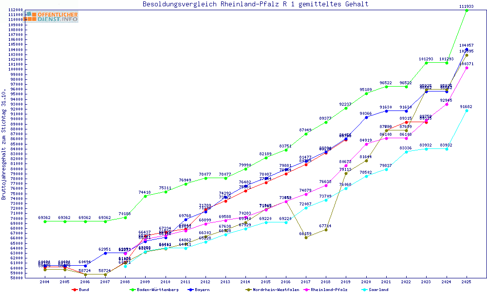 | Besoldungsvergleich R 1 im Jahr 2025 | gemitteltes Gehalt | ||||||