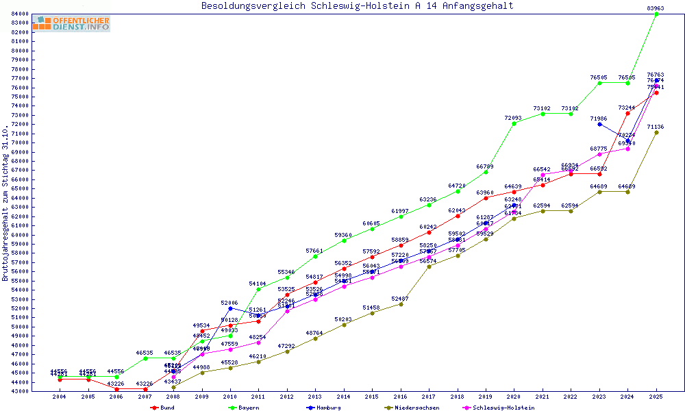 | Besoldungsvergleich A 14 im Jahr 2025 | Anfangsgehalt | ||||||