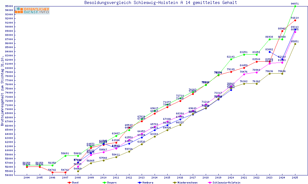 | Besoldungsvergleich A 14 im Jahr 2025 | gemitteltes Gehalt | ||||||