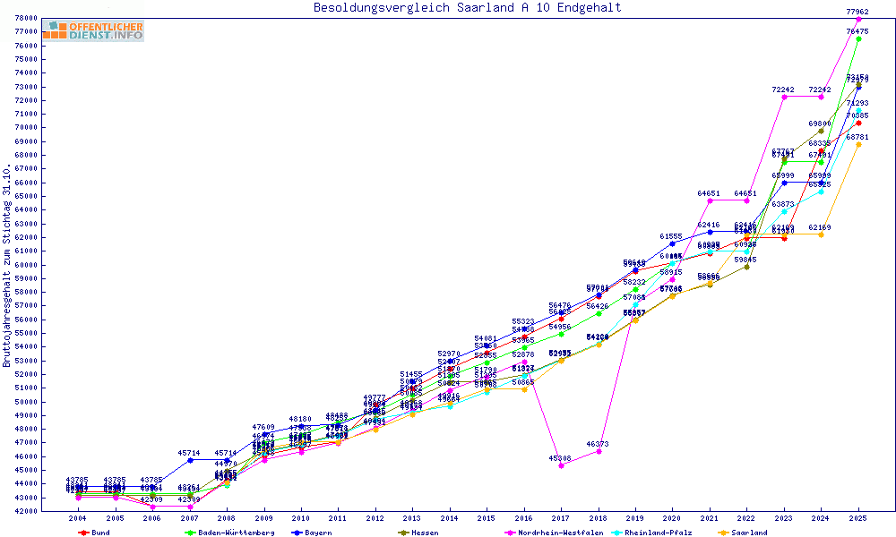 | Besoldungsvergleich A 10 im Jahr 2025 | gemitteltes Gehalt | ||||||