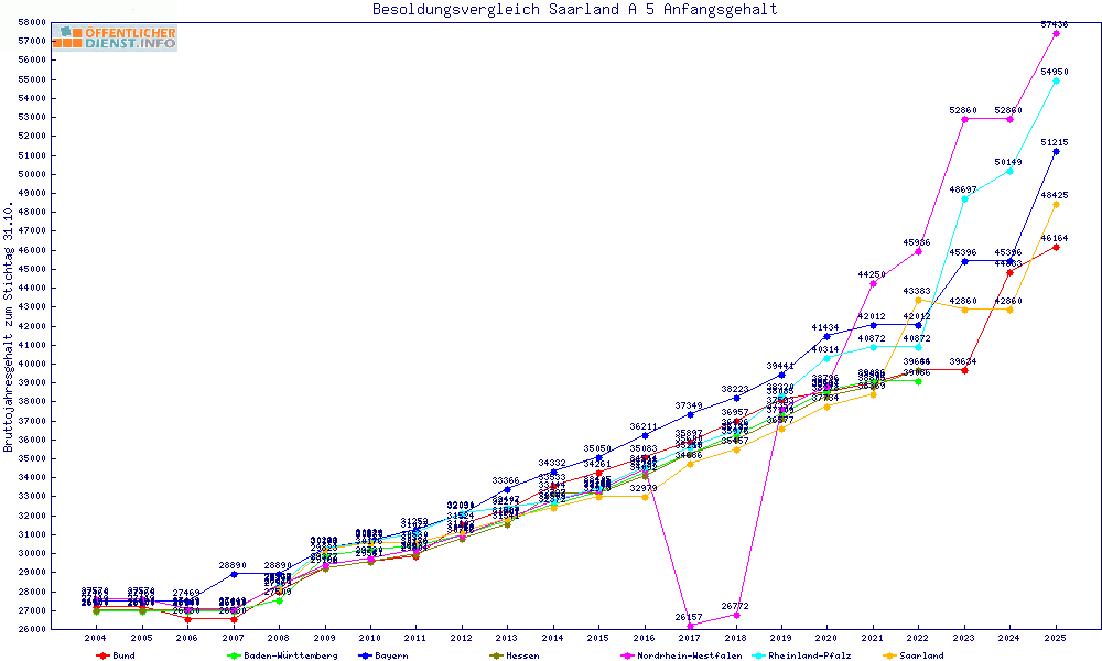 | Besoldungsvergleich A 5 im Jahr 2025 | Anfangsgehalt | ||||||