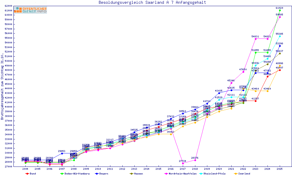| Besoldungsvergleich A 7 im Jahr 2025 | Anfangsgehalt | ||||||