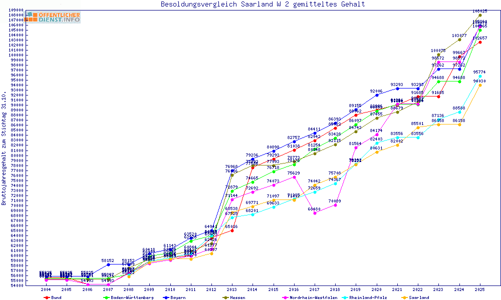 | Besoldungsvergleich W 2 im Jahr 2025 | gemitteltes Gehalt | ||||||