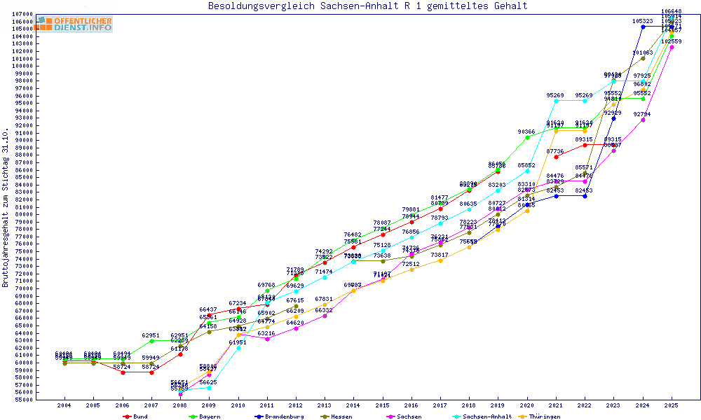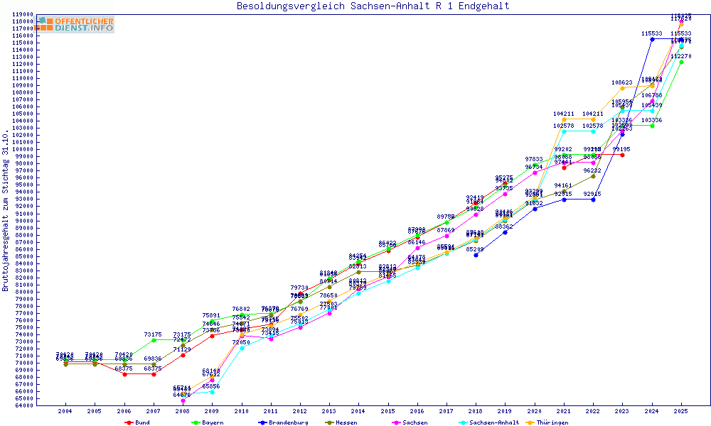 | Sachsen | 118.025 € | +3449 € | +3.0% | +6851 € | +6.2% | 31 Jahre | ||