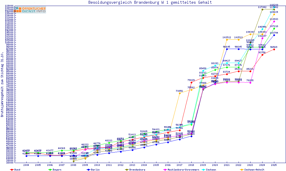 | Besoldungsvergleich W 1 im Jahr 2025 | gemitteltes Gehalt | ||||||