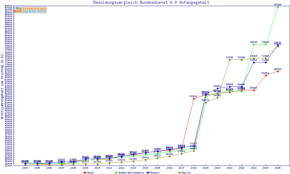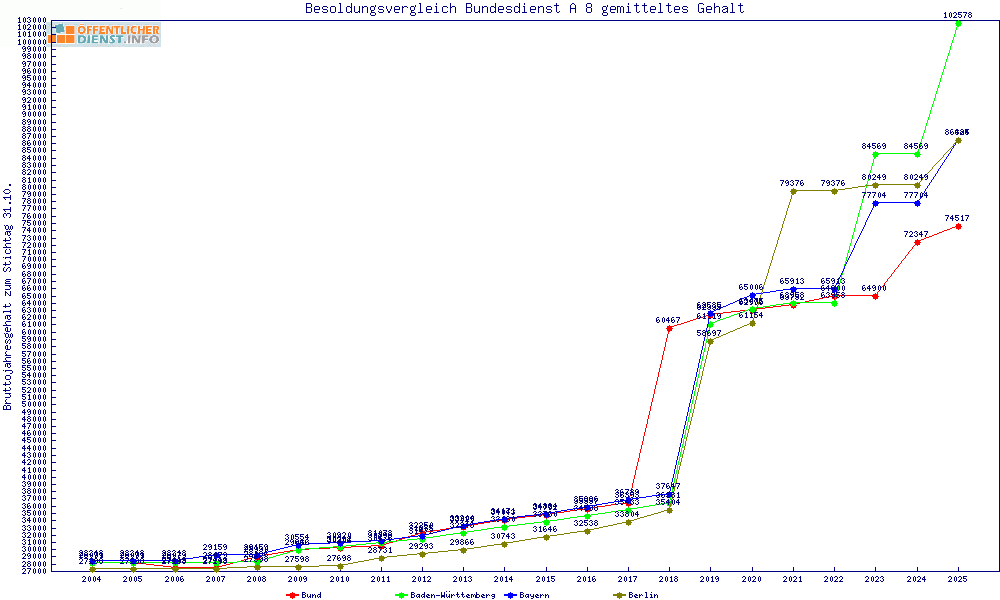 | Besoldungsvergleich A 8 im Jahr 2025 | Anfangsgehalt | ||||||