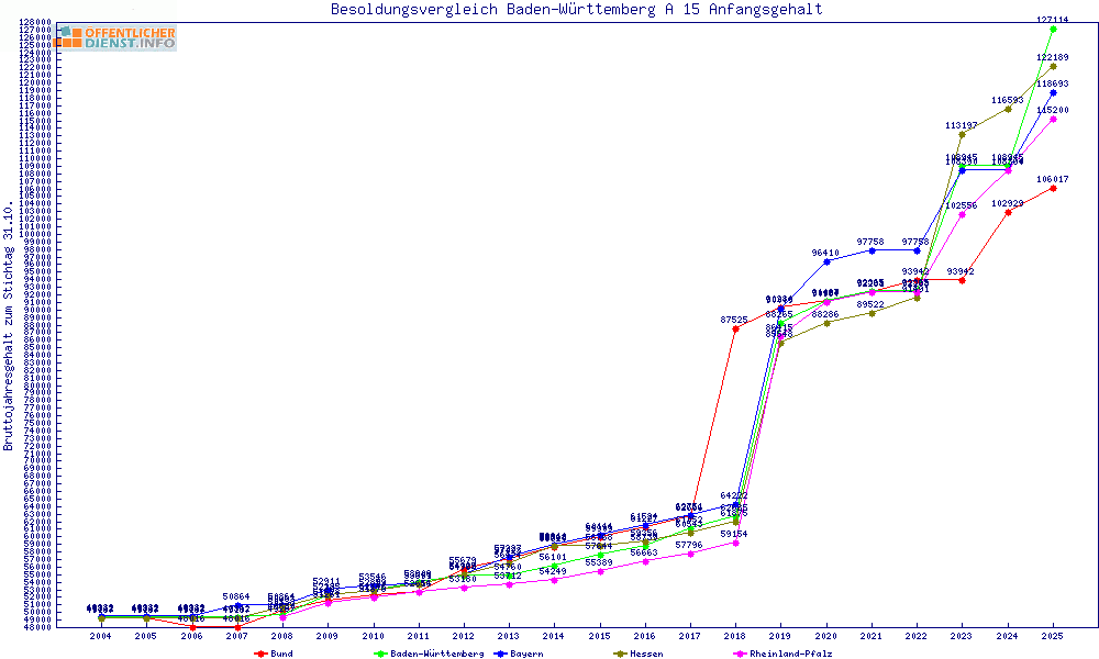 | Besoldungsvergleich A 15 im Jahr 2025 | Anfangsgehalt | ||||||