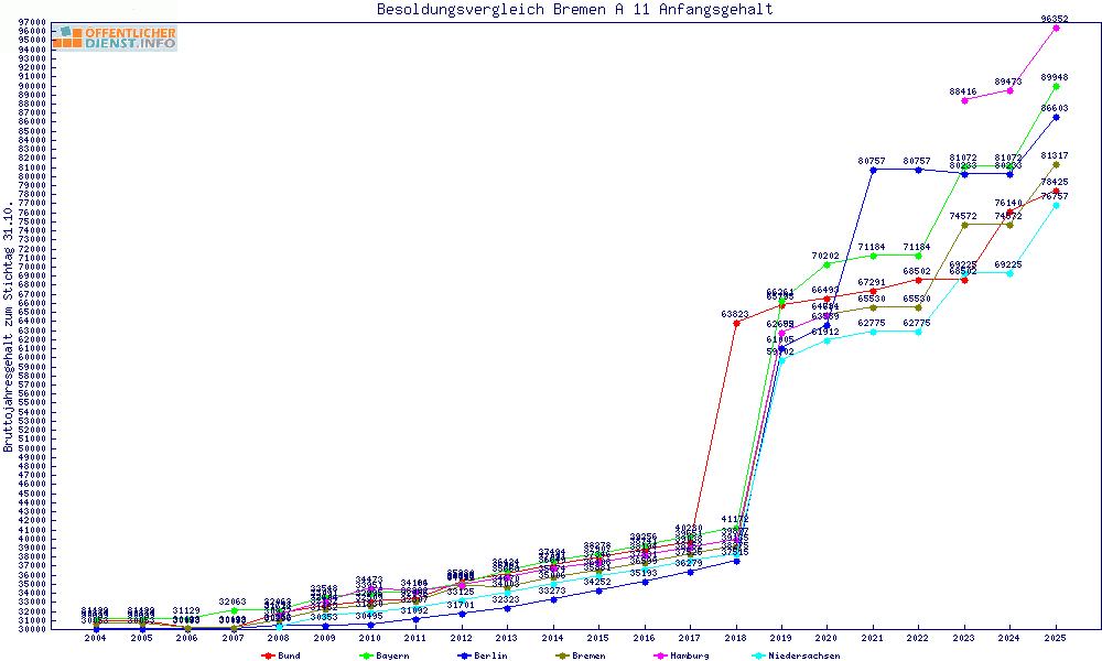 | Besoldungsvergleich A 11 im Jahr 2025 | Anfangsgehalt | ||||||
