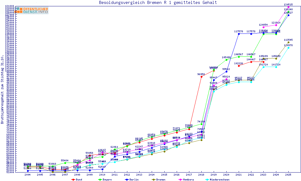 | Besoldungsvergleich R 1 im Jahr 2025 | gemitteltes Gehalt | ||||||