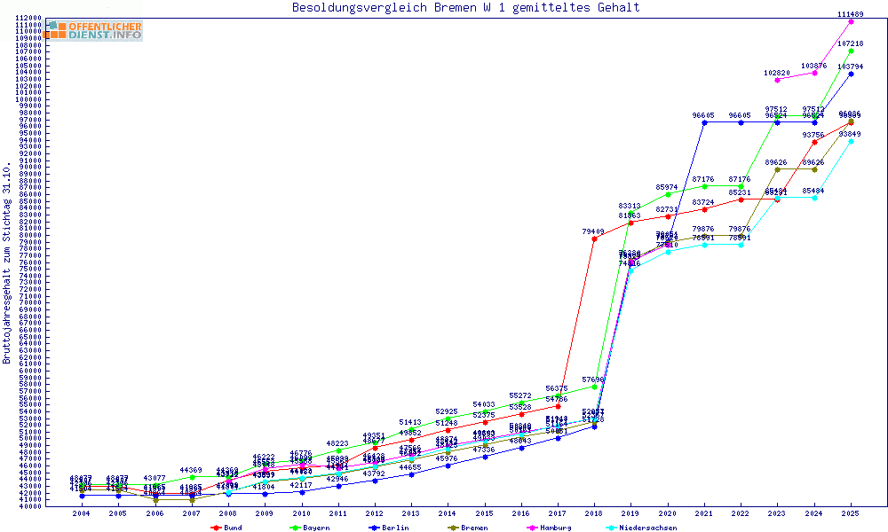 | Besoldungsvergleich W 1 im Jahr 2025 | gemitteltes Gehalt | ||||||