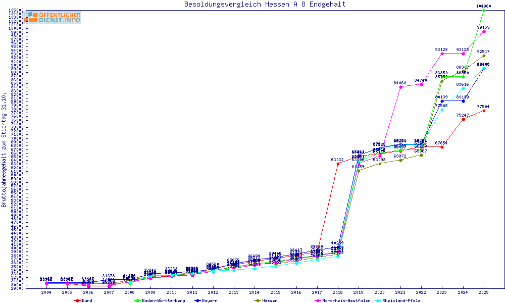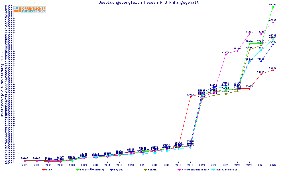 | Hessen | 92.518 € | +1710 € | +1.9% | 23 Jahre | ||||