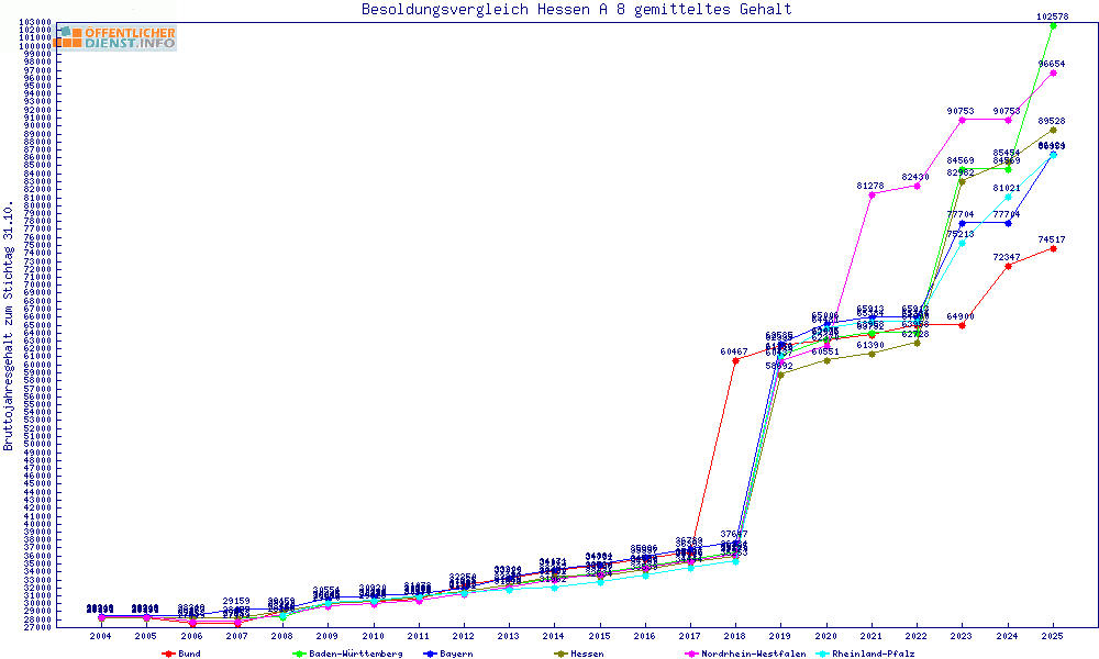 | Besoldungsvergleich A 8 im Jahr 2025 | gemitteltes Gehalt | ||||||