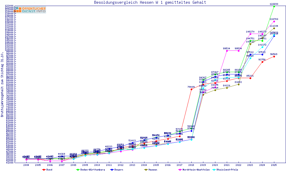 | Besoldungsvergleich W 1 im Jahr 2025 | gemitteltes Gehalt | ||||||