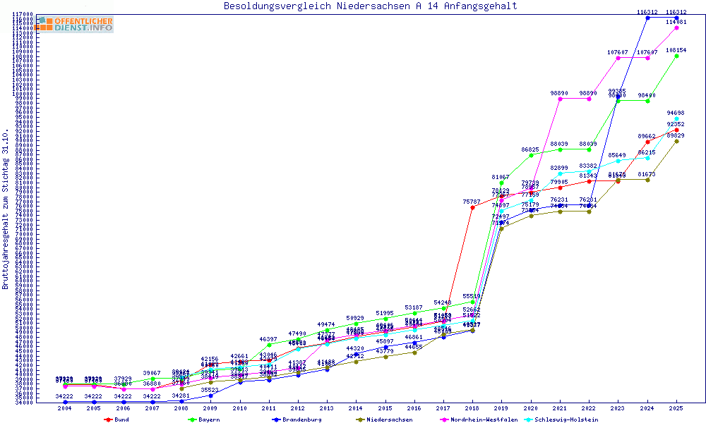 | Besoldungsvergleich A 14 im Jahr 2025 | Anfangsgehalt | ||||||