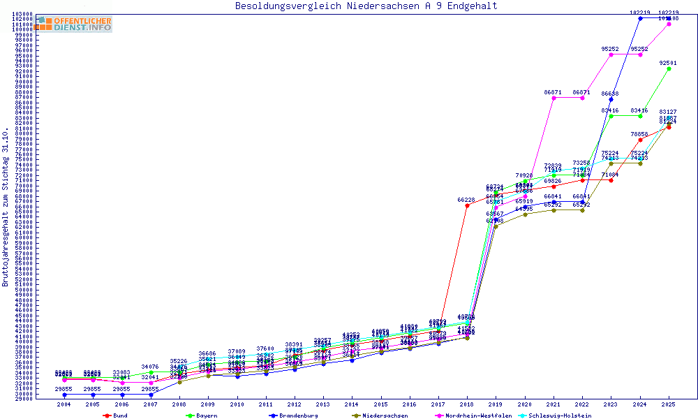 | Besoldungsvergleich A 9 im Jahr 2025 | Anfangsgehalt | ||||||