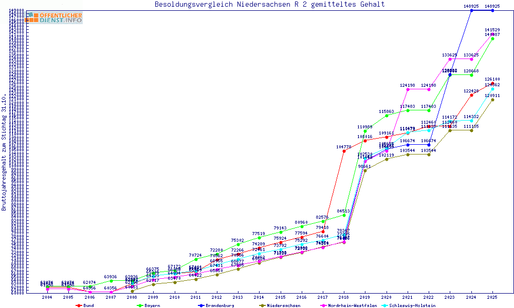 | Besoldungsvergleich R 2 im Jahr 2025 | gemitteltes Gehalt | ||||||