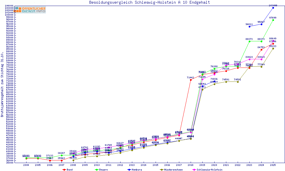 | Besoldungsvergleich A 10 im Jahr 2025 | gemitteltes Gehalt | ||||||